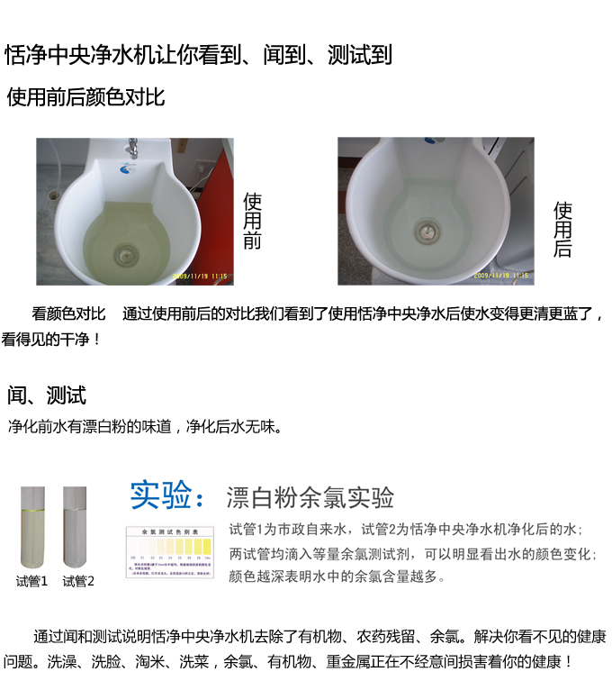 恬凈中央凈水機有效去除水中的異色、異味;進一步濾除水中微小雜質、膠狀體;去除水中的漂白粉余氯、農藥、重金屬;保留對人體有益的礦物質。使水變得碧清、碧藍,去除對人體有害的物質。