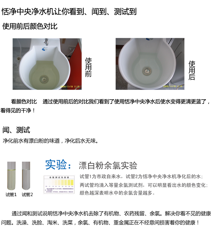 手動中央凈水機有效去除水中的異色、異味;進一步濾除水中微小雜質、膠狀體;去除水中的漂白粉余氯、農藥、重金屬;保留對人體有益的礦物質。使水變得碧清、碧藍,去除對人體有害的物質。