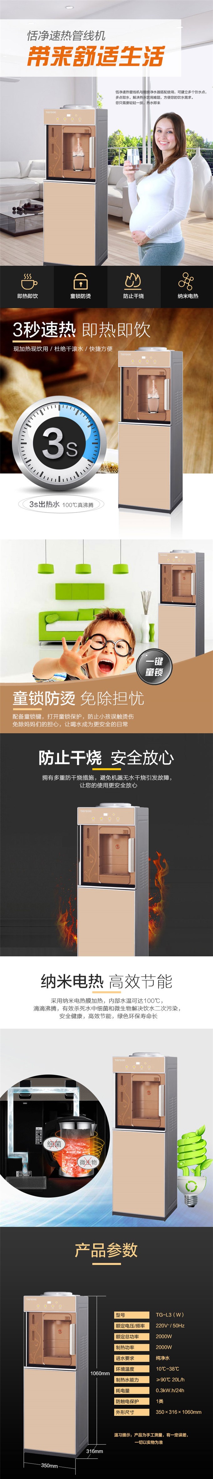 恬凈速熱管線飲水機TG-L3(W),采用納米電熱膜加熱技術,有效殺死水中的細菌微生物,防治二次污染。3秒速熱,隨時可喝上熱水。恬凈速熱管線飲水機TG-L3(W)自帶防干燒系統與童鎖,安全省心。